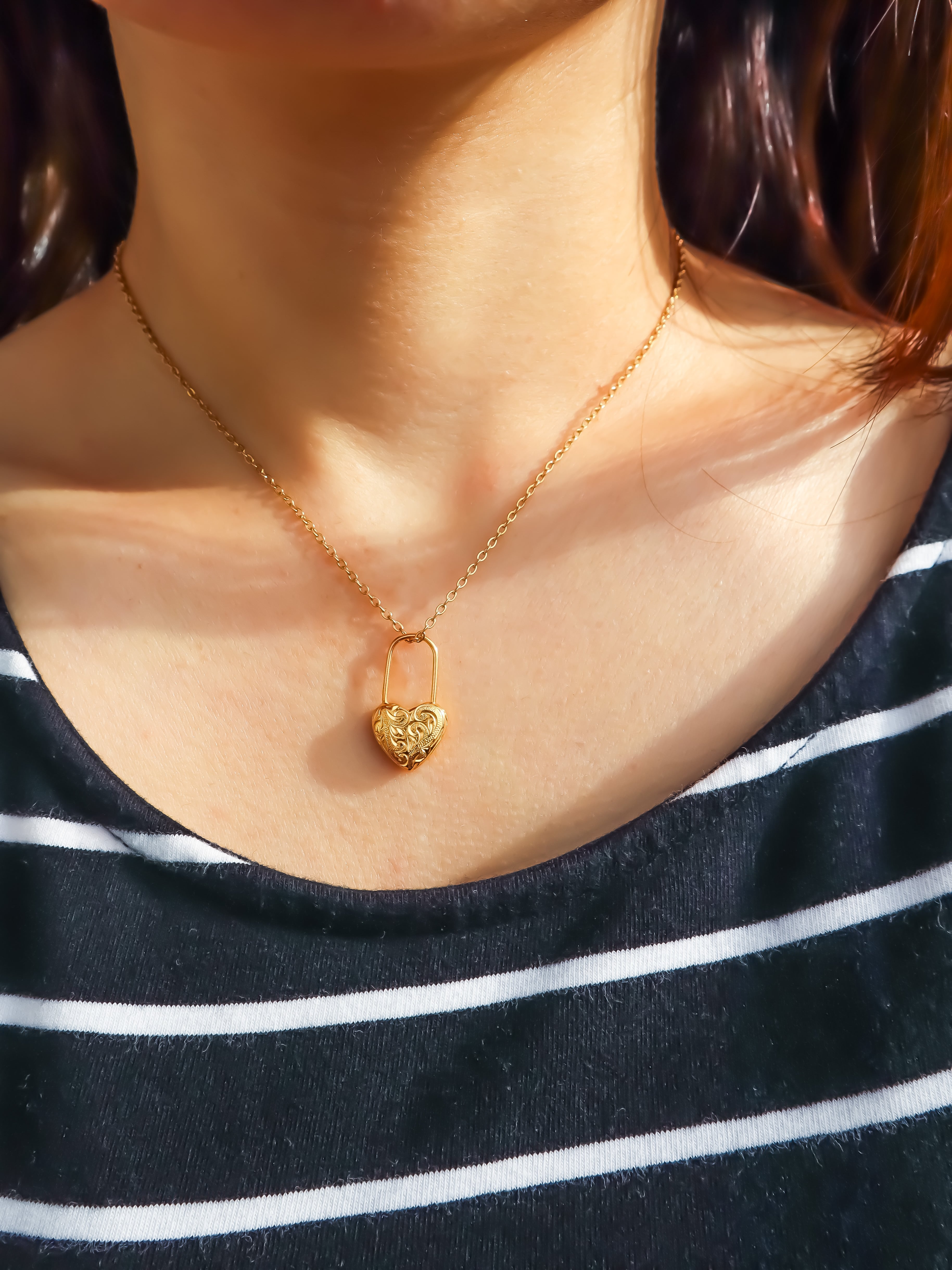 クラシックなデザインとモダンなエッセンスを融合したハートパドロックネックレス。