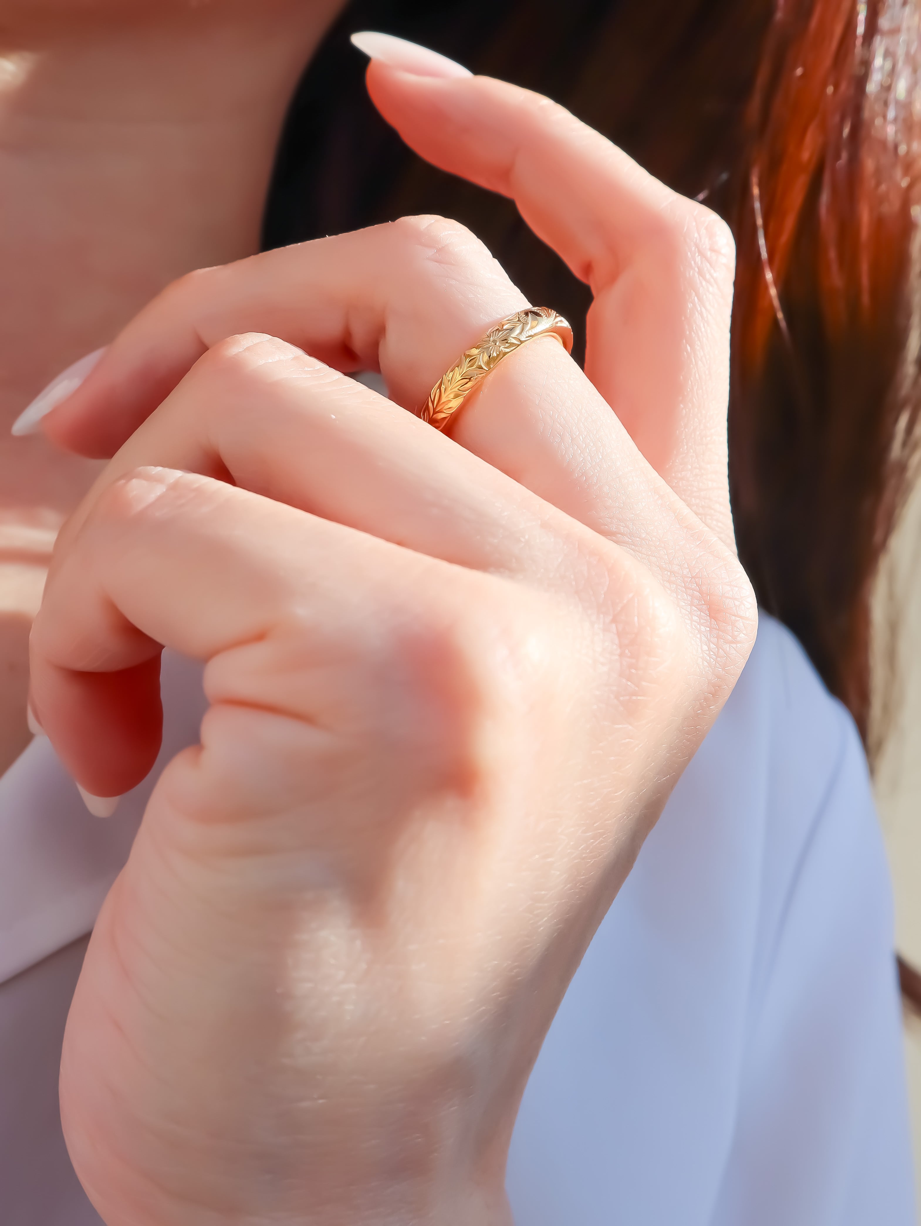 リングの片側には「スクロール(波模様)」を、もう片側には「マイレリーフ(聖なる葉)」を丁寧に彫り込んでおり、付け方より表情が変わる唯一無二のハワイアンリングです。