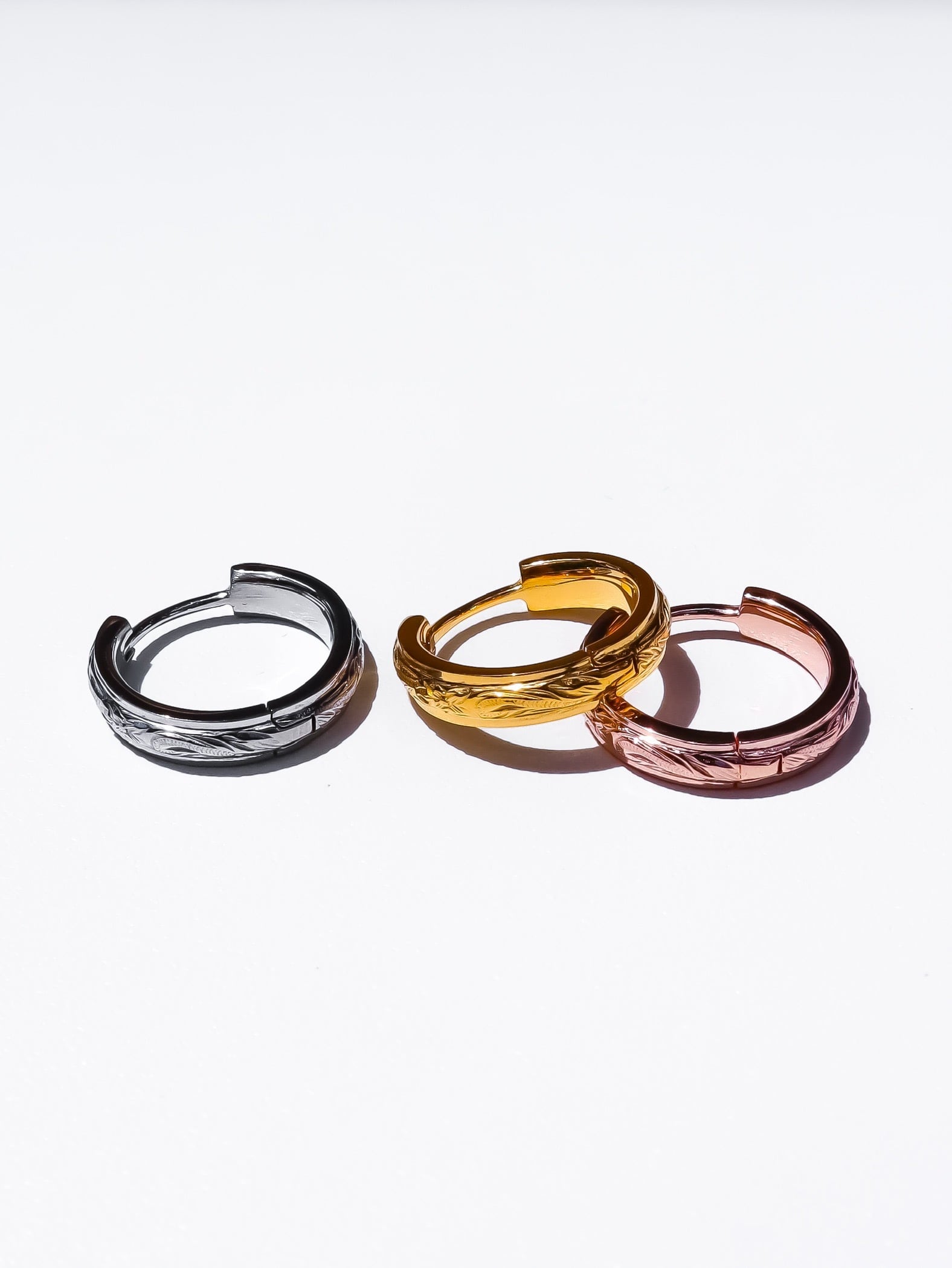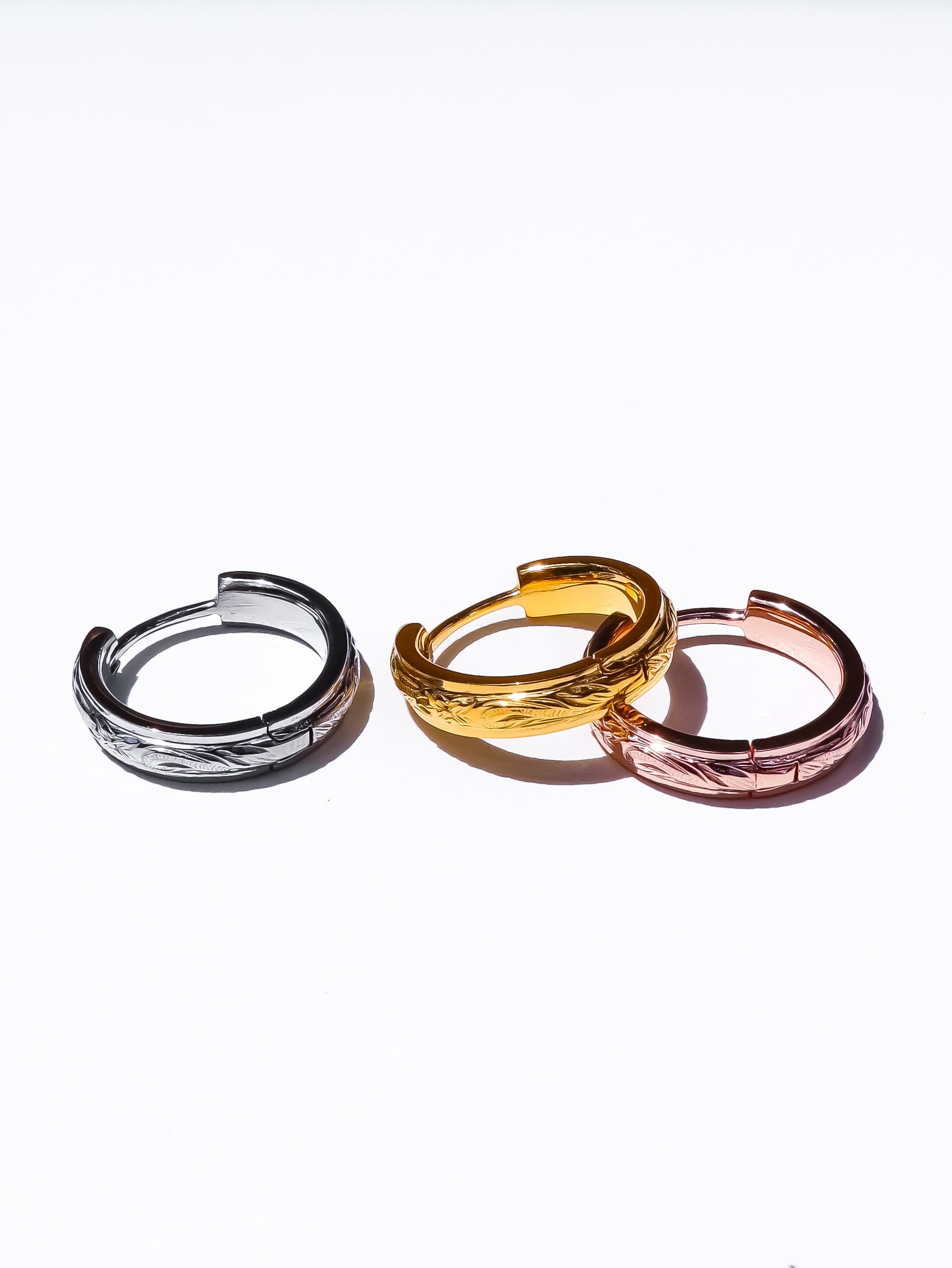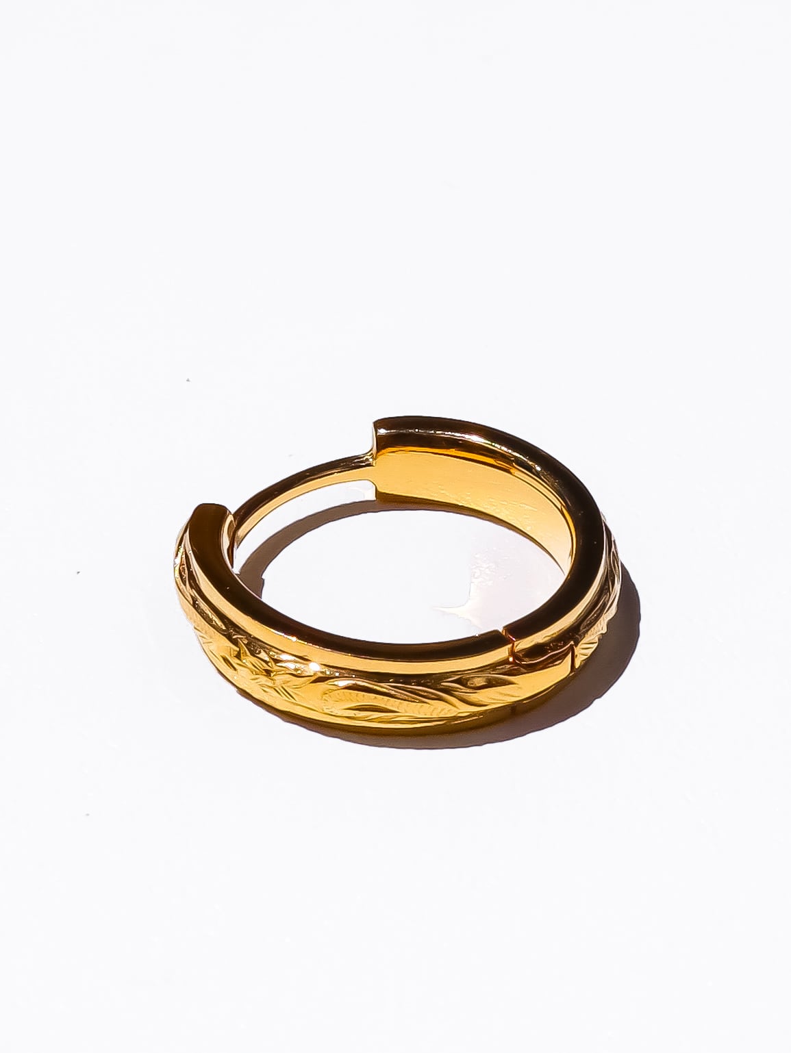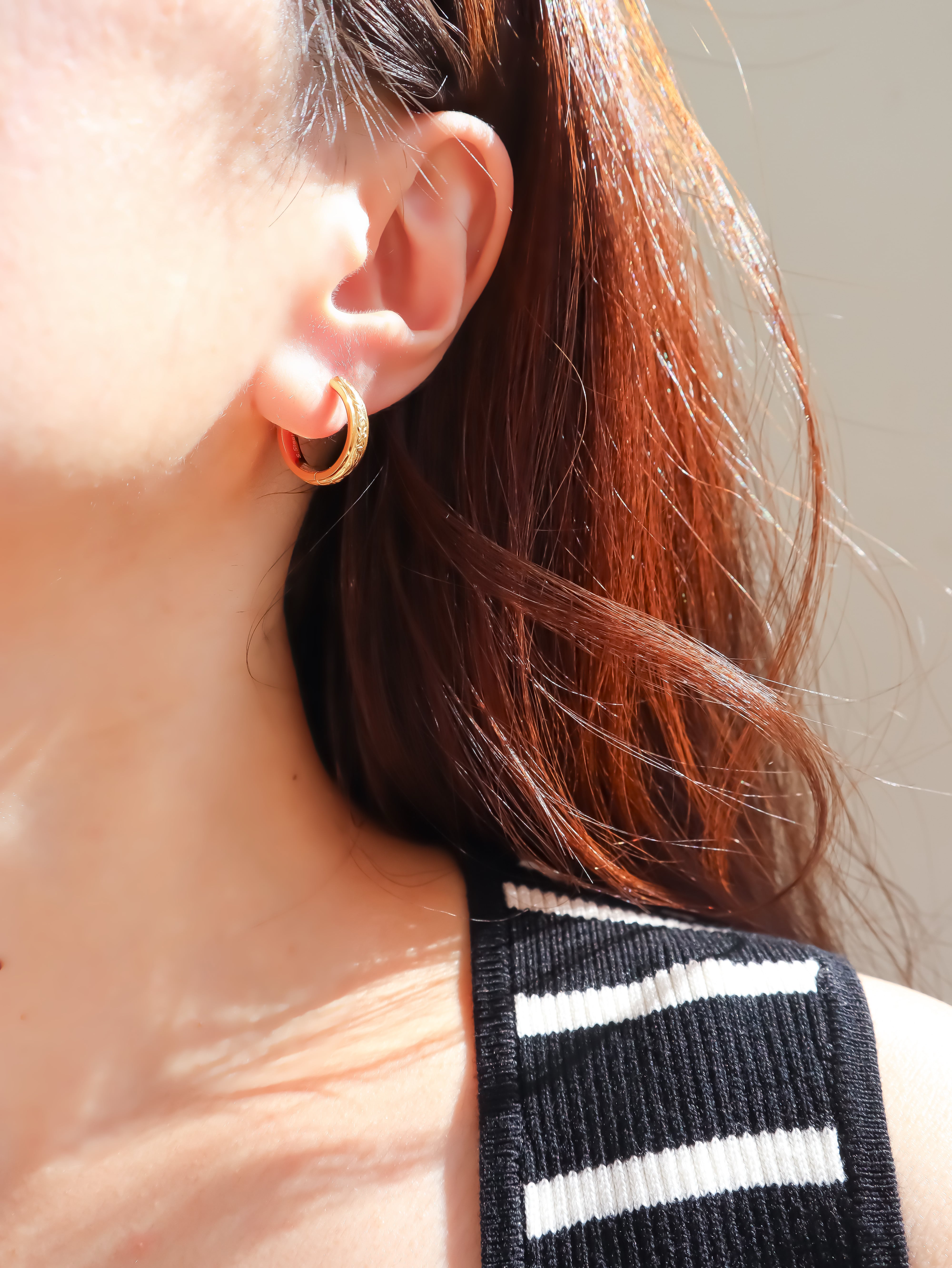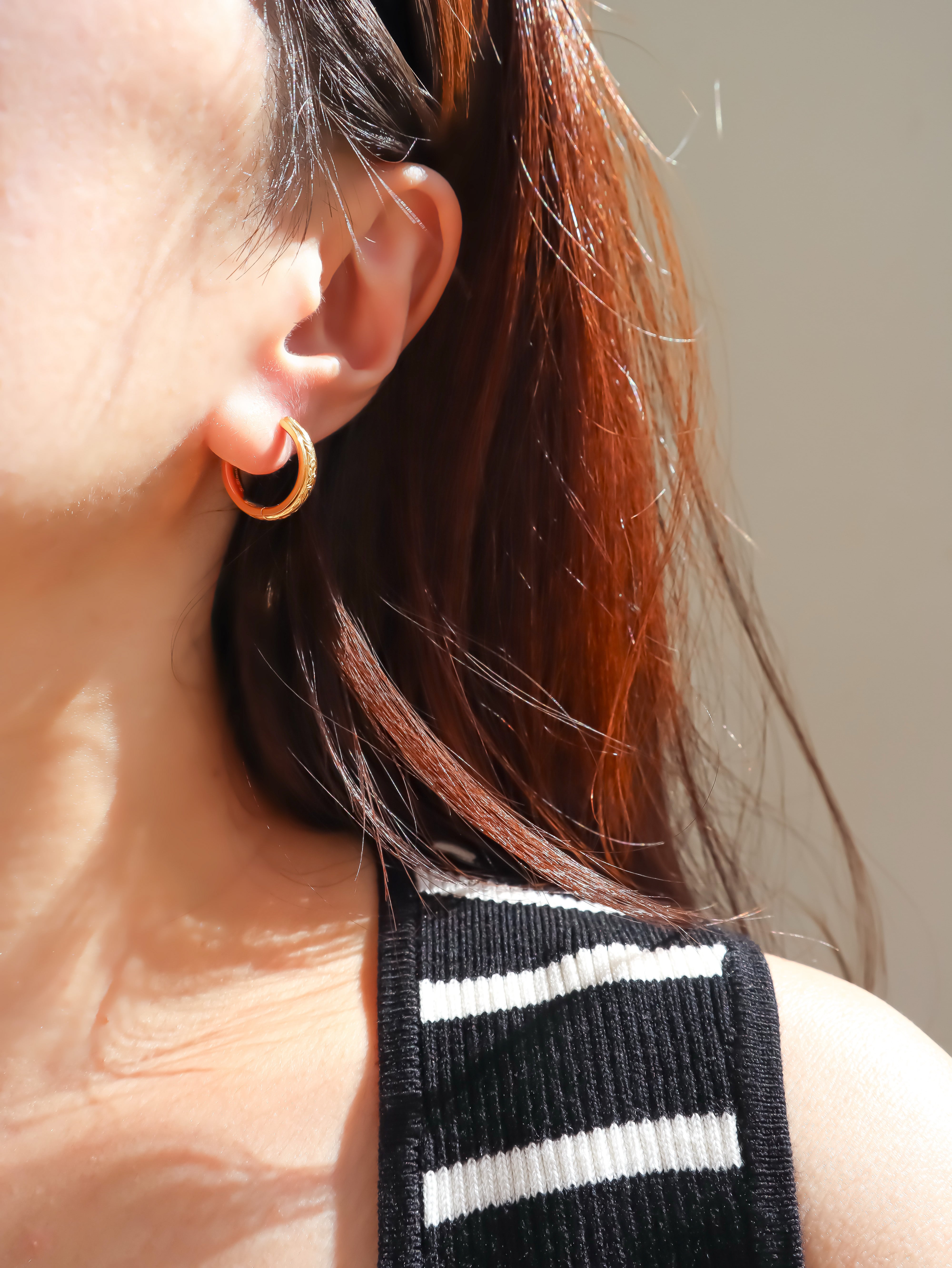耳元に上品な存在感を添える、彫りディテールが美しいフープピアス。クラシカルなモチーフを現代的なフォルムで再構築し、洗練された印象に仕上げました。