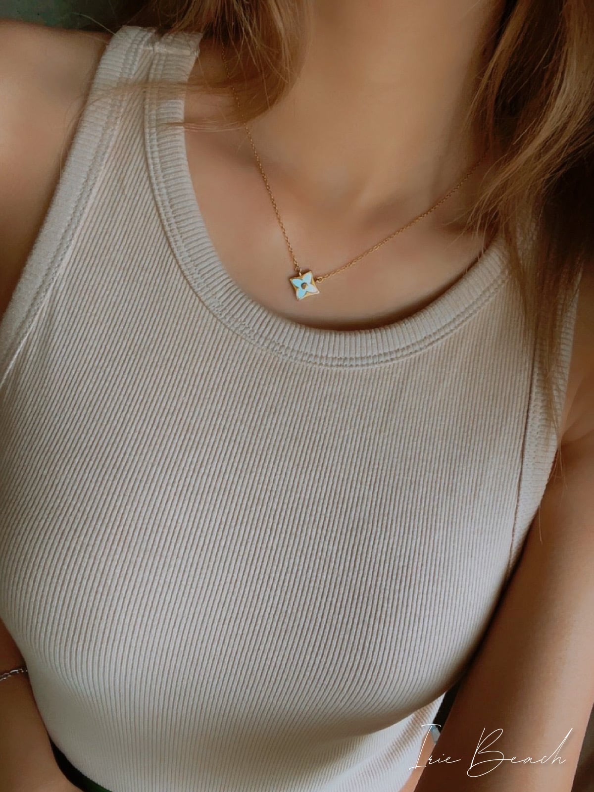 シェルプレートが着けるだけでデコルテが明るい印象に。