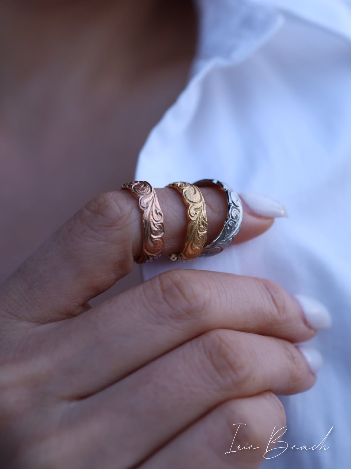 リングの縁をカットするカットアウト技法の、スクロール柄(波)リング。