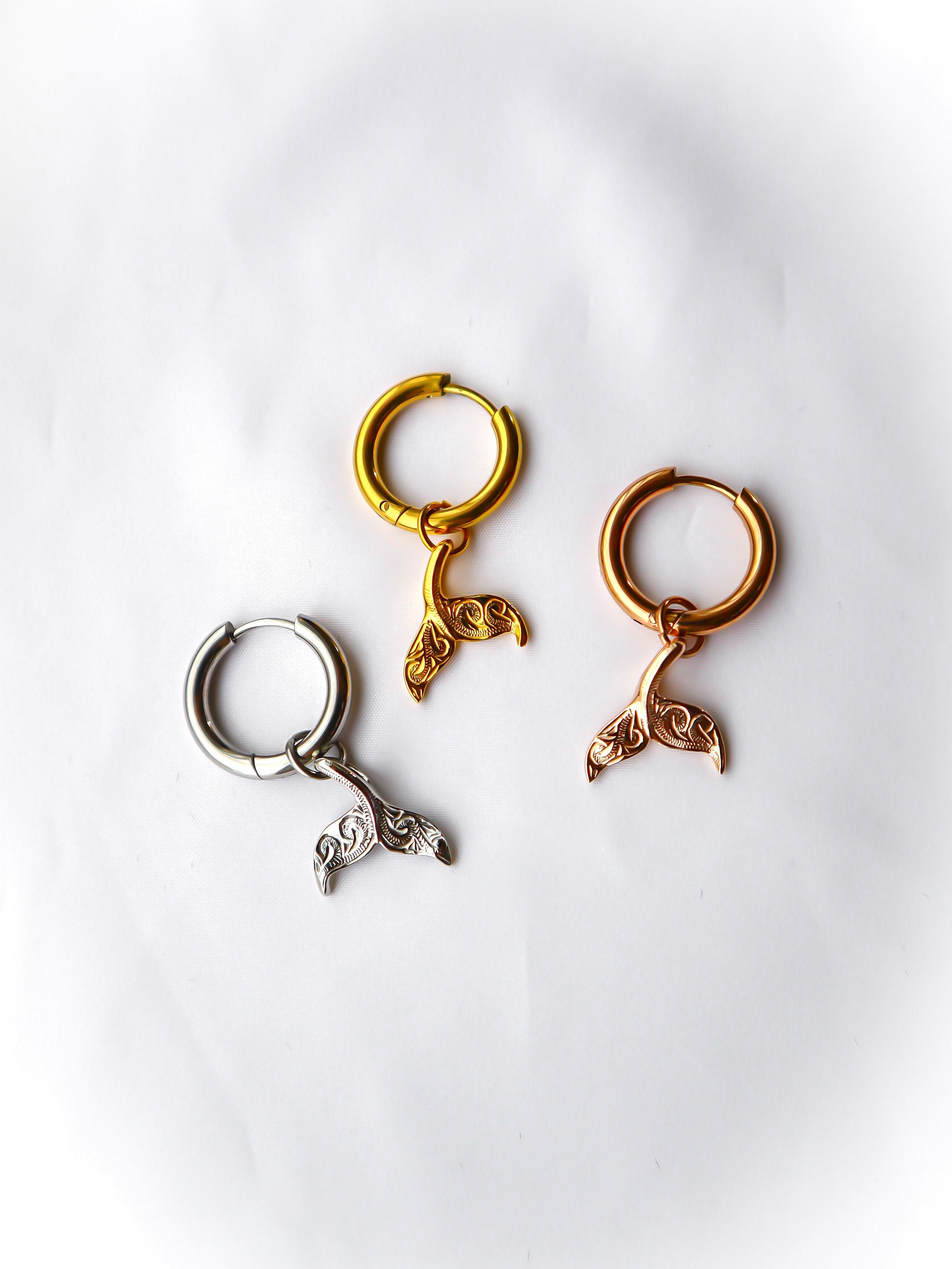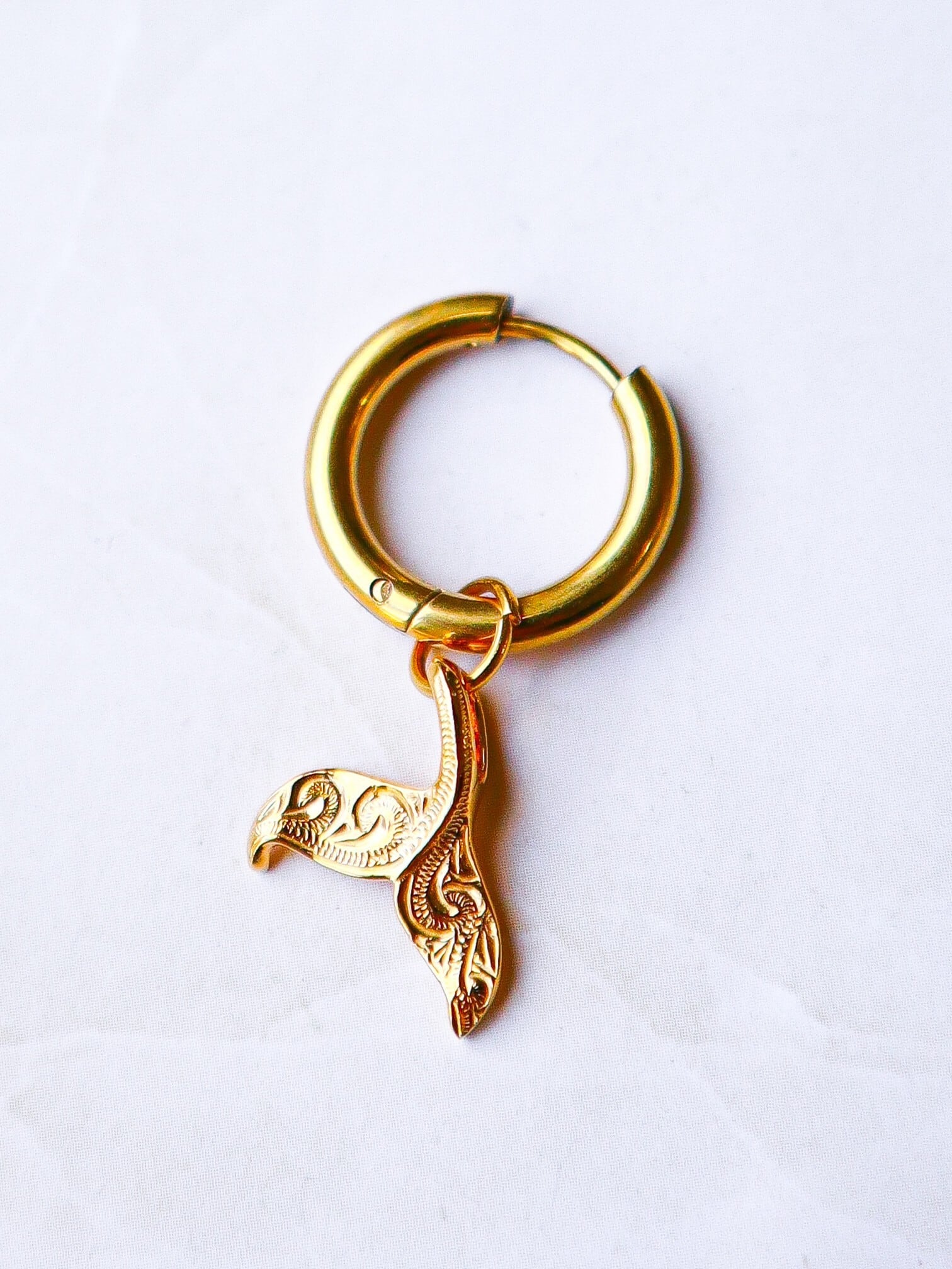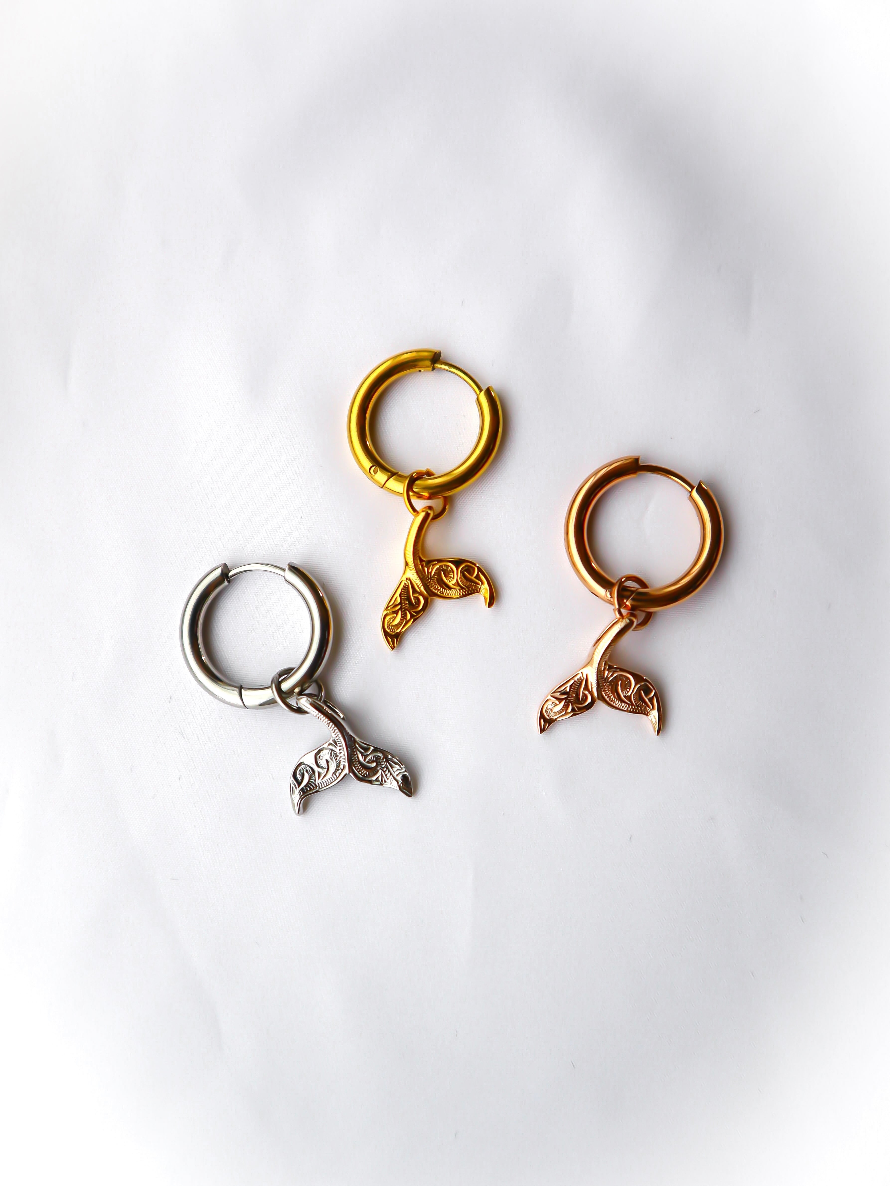 ハワイアンの伝統的なスクロール彫りが施された小ぶりなクジラの尾のデザインが特徴で、シンプルながらも存在感のあるアイテムです。