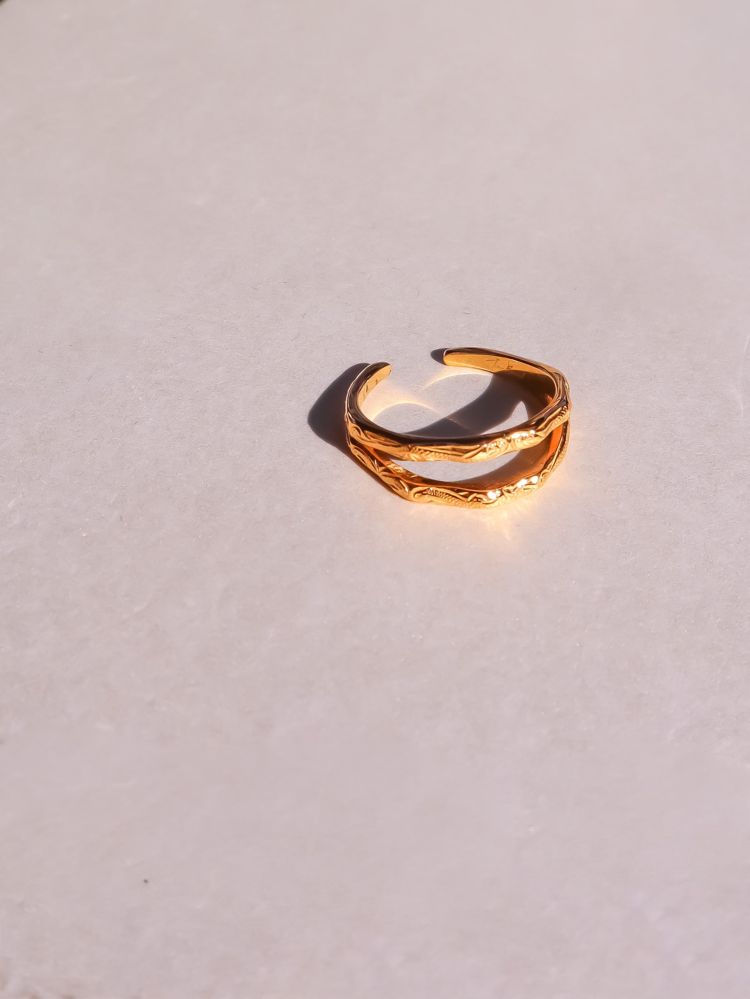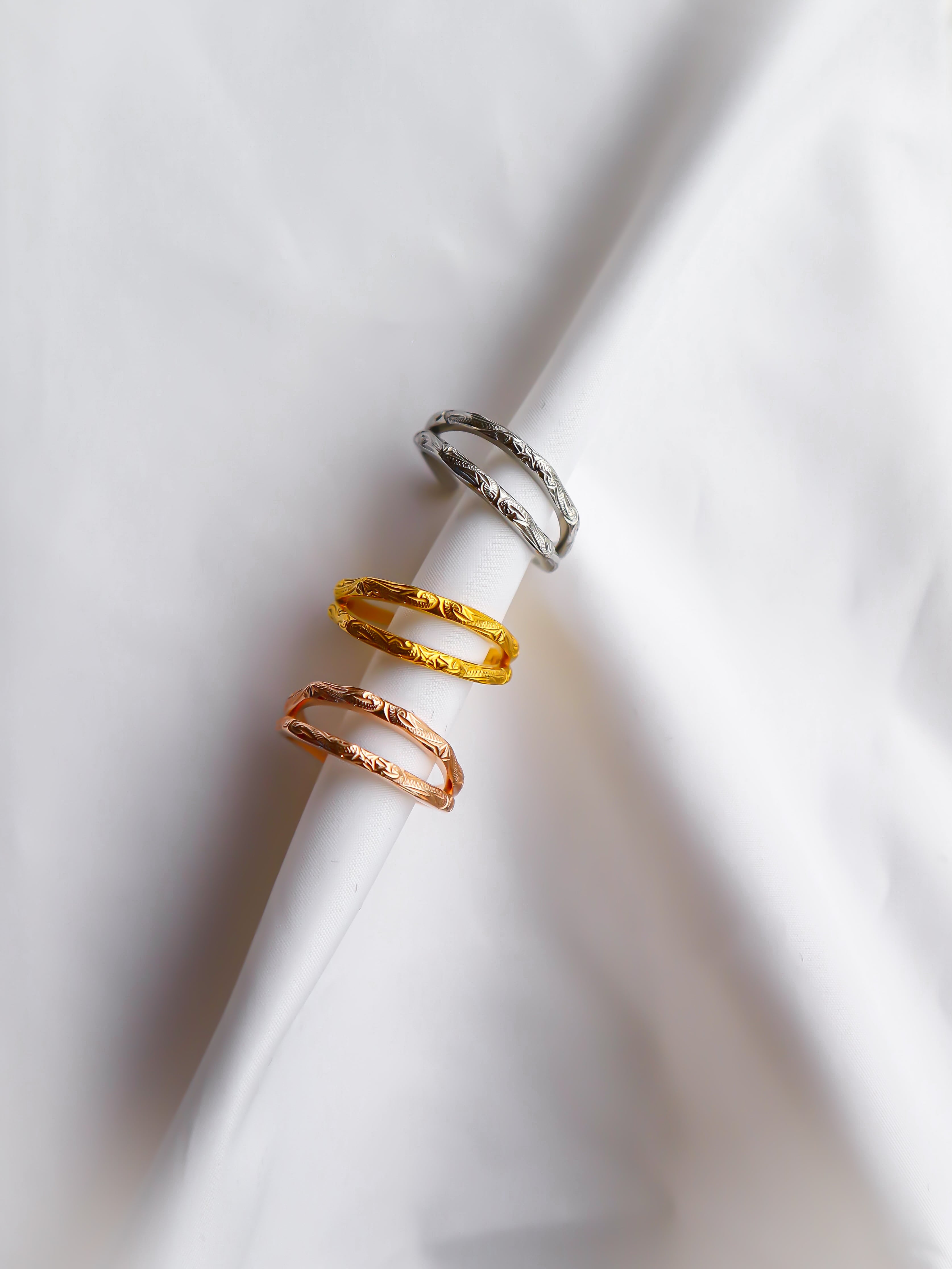 表面にはハワイの伝統的な彫り、スクロールが施されており、シンプルながらも個性的なデザインに仕上がっていて表面の凹凸のある質感が光の反射を柔らかくし、優雅な輝きを演出します。